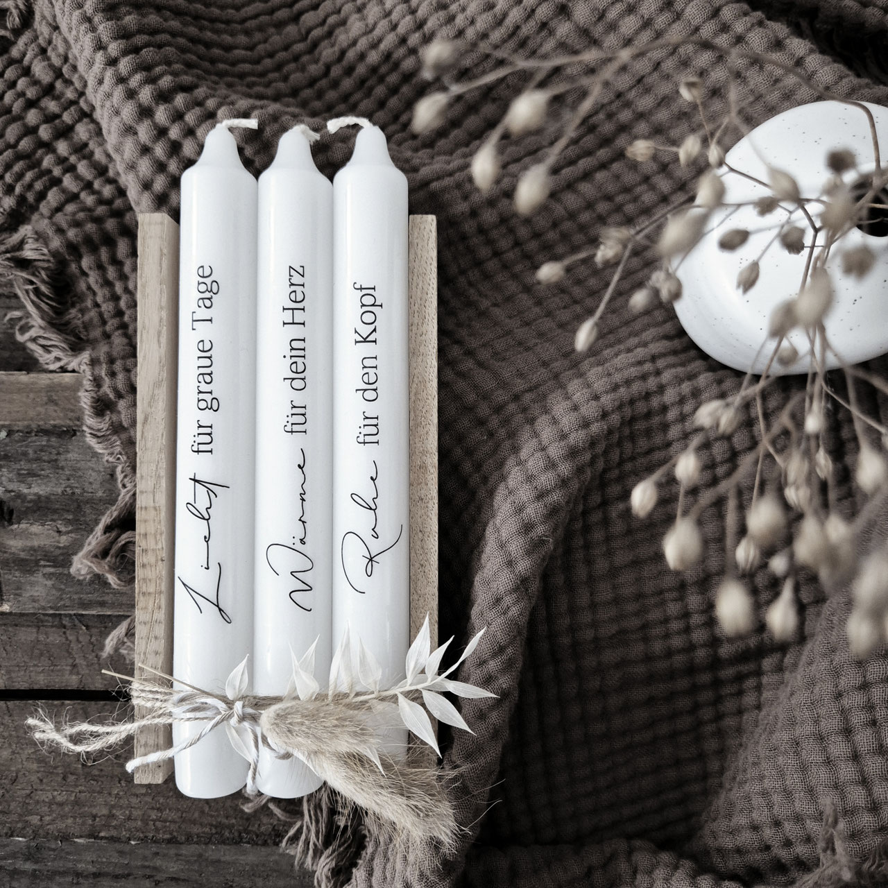 Set besteht aus: 4-er Set beschriftete Kerzen im handgemachten Papierschächtelchen